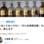 2019年3月7日 / 最終更新日時 : 2019年3月7日 satoru781108 がん治療 手を出してはいけない「がん未承認治療」の見分け方、教えます 最近、講談社のサイトに2本の記事を寄稿しました。その1本目のご紹介です。 がん患者さんの中には有効性の確認された標準治療以外にできることはないかと、未承認治療を試みる方もいます。ただ未承認治療は玉石混淆で、 […]